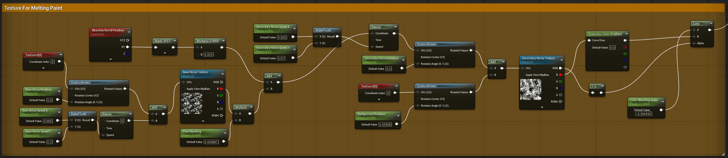 To add a final touch I wanted to experiment with vertex shading and implemented a simple displacement logic to make the melting paint behave more slime and wobble like. I used another Noise Texture Sample here to drive the WPO in a more specific way like a gel fluid. The artist has control of the wobble like animation by changing the coordinates (U and V) as well as the speed of the panning. I have two nodes responsible for the magnitude of the displacement, one is the strength scalar and the other is a strength multiplier (more powerful)