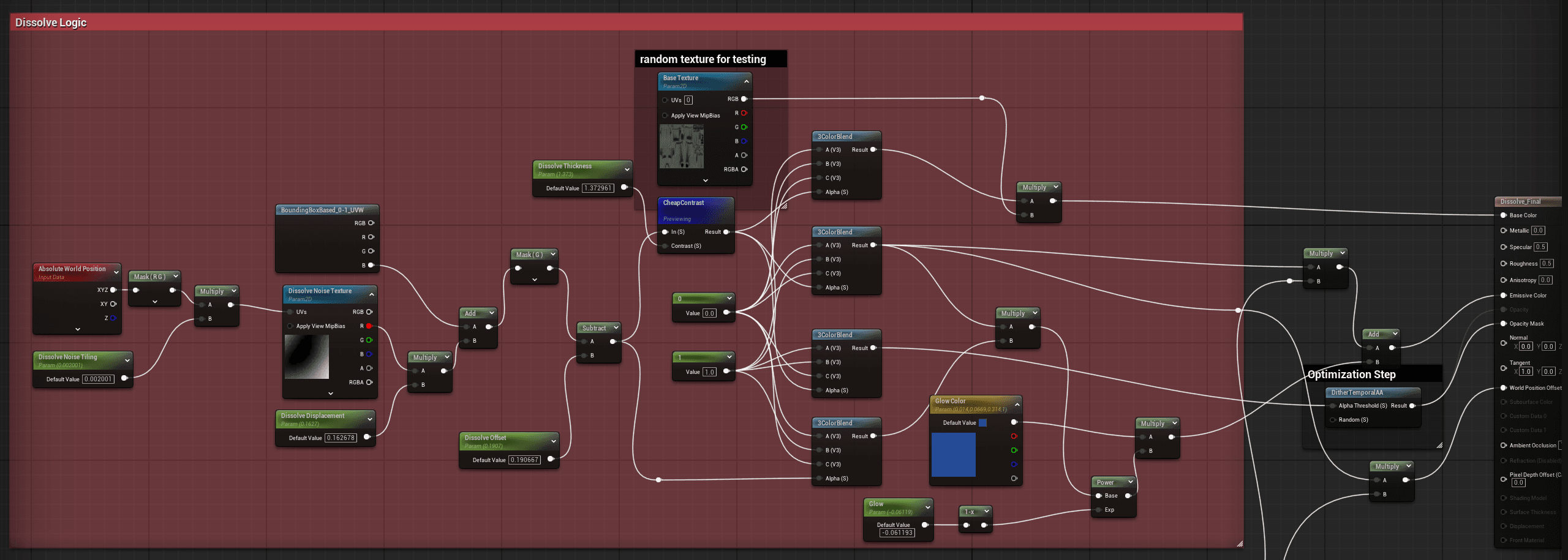 To solve the dissolving effect, I wanted to ensure that the melting effect would start from the top to bottom. This began with a bounding box based node, the blue channel is combined with a dissolve noise texture to distort the edge. The noise texture is multiplied by a dissolve noise tiling to give control of the UV seams to the artist. These are then separated into 3 color blends by using a cheap contrast node, creating the dissolved layer, the dissolving edge, and the material underneath. I added a node to account for glow for more customization before plugging the opacity mask into a Dither Temporal AA Node